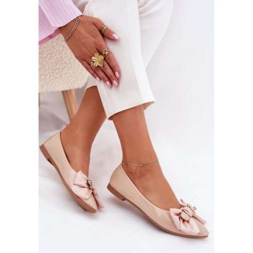 Lakierowane Baleriny Z Kokardą I Złotą Broszką Beżowe beżowy