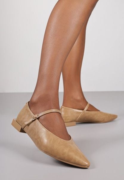 Ciemnobeżowe Balerinki Vices ze Skórzaną Wkładką i Paskiem z Klamerką Eslerie