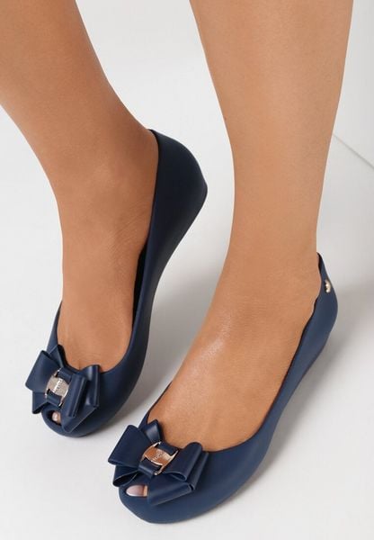 Balerinki Echobelle na niskim, ukrytym koturnie. Z okrągłym noskiem udekorowanym drobnym wycięciem i aplikacją – kokardką. Wsuwane, z drobnym elementem w tylnej części. W całości wykonane z gumy. Fantastycznie będą prezentować się w duecie zarówno ze spodniami, jak i sukienkami. Rozmiarówka jest zaniżona, dlatego zachęcamy do wyboru balerinek o 1 rozmiar większych niż zazwyczaj.