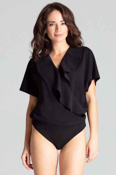 Czarne Kopertowe Body z Falbanką
