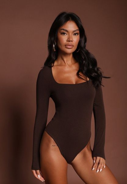 Brązowe Body z Wiskozą i Bawełną Ozdobione Kwadratowym Dekoltem Amerrise