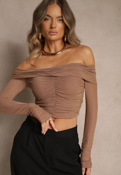 Ciemnobeżowa Drapowana Bluzka VICES z Odkrytymi Ramionami i Siateczkowymi Rękawami Atevite