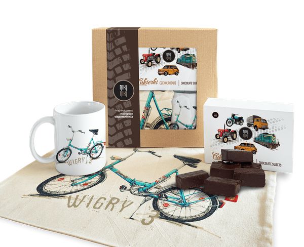 Paczka prezentowa z rowerem Wigry 3 cukierki czekoladowe 125 gkubek ceramicznytorba bawełniana Paczkę można dodatkowo powiększyć o koszulkę lub bluzę (Kliknij aby zobaczyć wymiary i specyfikacje)Rower Romet Wigry 3Autorem rysunku jest Mariusz Felek Foltak.