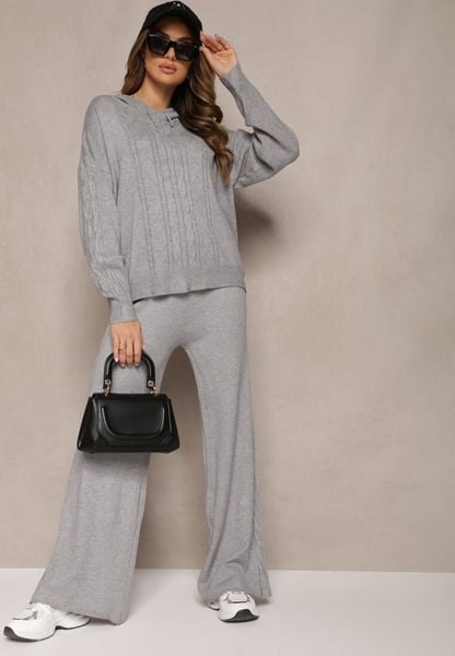 Szary Komplet z Dzianiny Oversizowa Bluza z Kapturem i Spodnie z Szerokimi Nogawkami Mathuva