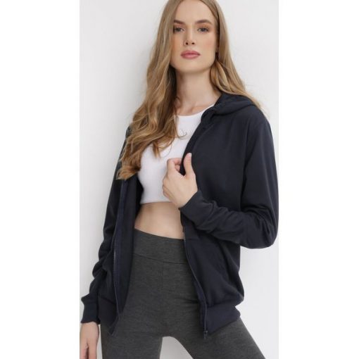 Granatowa Casualowa Bluza z Dodatkiem Bawełny Zapinana na Suwak z Kapturem Arkatia