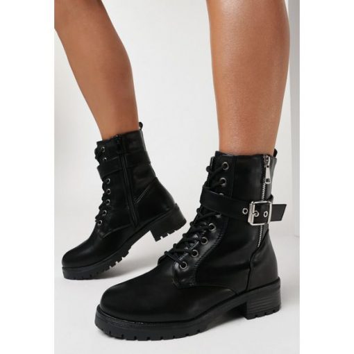 Botki Ollia w stylu trzewików. Na grubej podeszwie z niskim obcasem i protektorem, Smukły, okrągły nosek, cholewka za kostkę. Z przodu sznurowanie, wokół kostki pasek ze sprzączką. Dekoracyjny suwak z boku. Zapinane na zamek błyskawiczny po wewnętrznej stronie. Wykonane z ekoskóry, lekko ocieplone. Doskonałe do rockowych stylizacji na sezon jesień-zima.