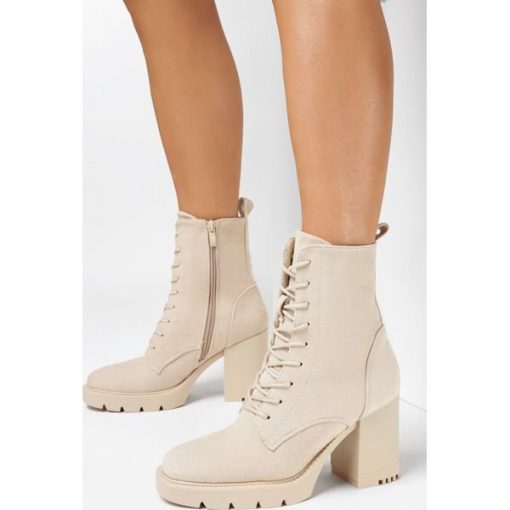 Botki Ophelie na stabilnym, słupkowym obcasie oraz niskiej platformie z protektorem, który zapewnia stabilizację. Z przodu sznurowane. Cholewka sięgająca za kostkę, zapinana na zamek błyskawiczny od wewnętrznej strony. Model wykonany z gładkiego ekozamszu, z wkładką z ekoskóry. Nieocieplane. Wyglądają fantastycznie w połączeniu ze wzorzystą sukienką lub skórzanymi spodniami skinny!