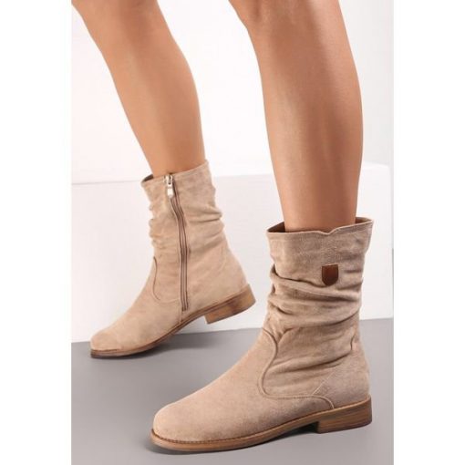 Ciemnobeżowe Botki do Połowy Łydki z Imitacji Zamszu i Marszczoną Cholewką Alemiphae