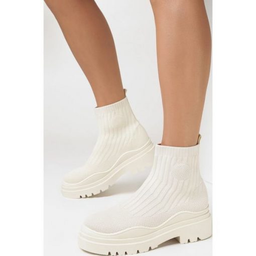Botki Lazeos na grubej podeszwie z protektorem, zdobioną falowaną wstawką wokół cholewki. Wykonane z elastycznego materiału tekstylnego. Wysoka, skarpetkowa cholewka sięgająca za kostkę. Wygodnie wsuwane. Nieocieplane, z materiałową wkładką. Noś je w towarzystwie trencza lub oversizowej kurtki pikowanej!
