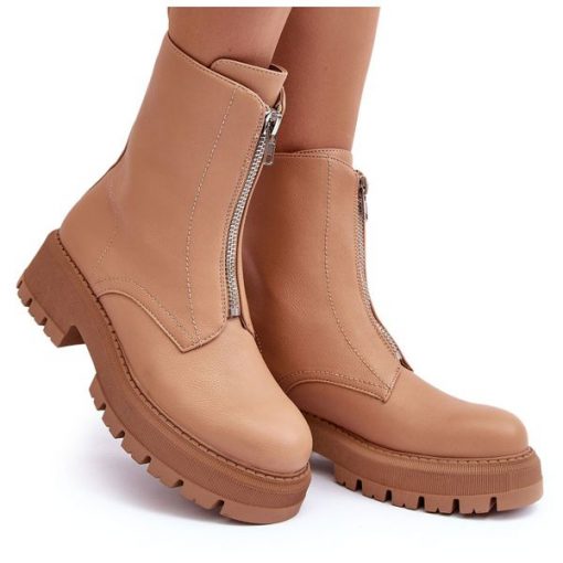PS1 Skórzane Botki Na Płaskim Obcasie Z Suwakiem Camel Vimal beżowy