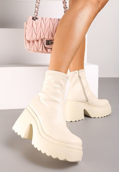 Beżowe Botki na Obcasie i Platformie z Dopasowaną Cholewką Zapinane na Suwak Reliefra