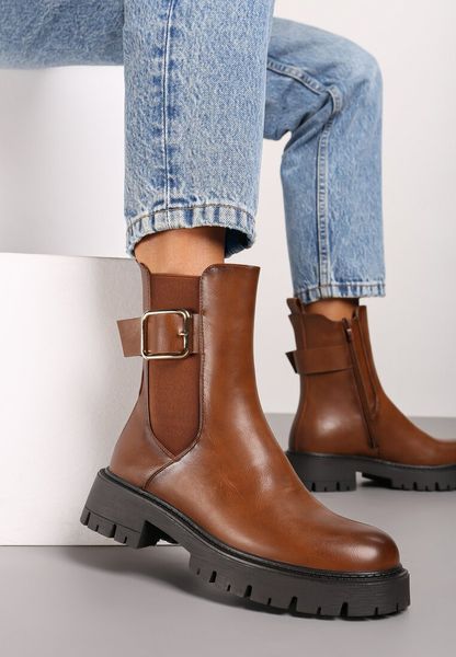 Brązowe Botki Sztyblety na Tłoczonej Podeszwie z Elegancką Klamerką przy Cholewce Vaithora