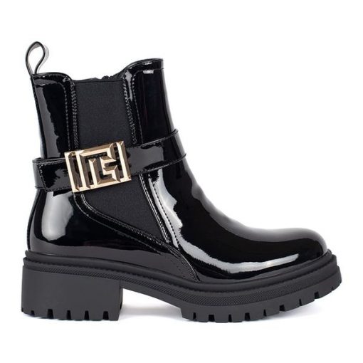 Czarne Lakierowane Botki Sztyblety na Płaskiej Podeszwie Ozdobione Klamrą Linitha