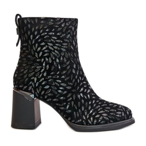 S.Barski Zamszowe Botki Na Słupku Z Ozdobnym Tłoczeniem D&A CR42-192 Czarne