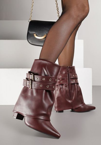 Bordowe Botki na Słupku w Stylu Bikerów Ozdobione Klamrą i Wywiniętą Cholewką Bralinea