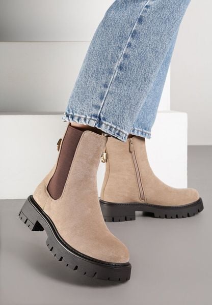 Ciemnobeżowe Botki Sztyblety Wykończone Metaliczną Klamrą i Elastyczną Wstawką Lericeas