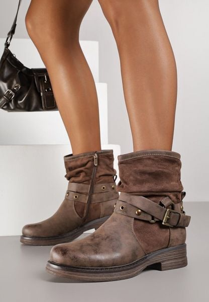Brązowe Marszczone Botki Bikery z Paskami i Metalicznymi Klamrami Lirrive