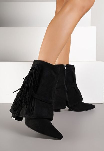 Czarne Botki Boho z Cholewką Imitującą Nogawkę i Frędzlami Zaslie