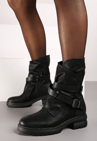Czarne Botki z Nieregularną Cholewką Zdobioną Paskami i Sprzączkami Zinbelle