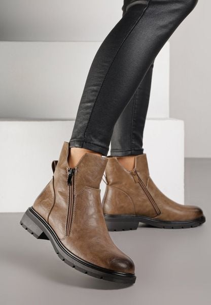 Jasnobrązowe Asymetryczne Botki Zdobione Suwakiem i Wycięciami w Cholewce Balles