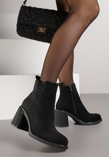 Czarne Botki do Kostki VICES z Imitacji Zamszu na Słupkowym Obcasie z Aplikacją przy Cholewce Nelerie