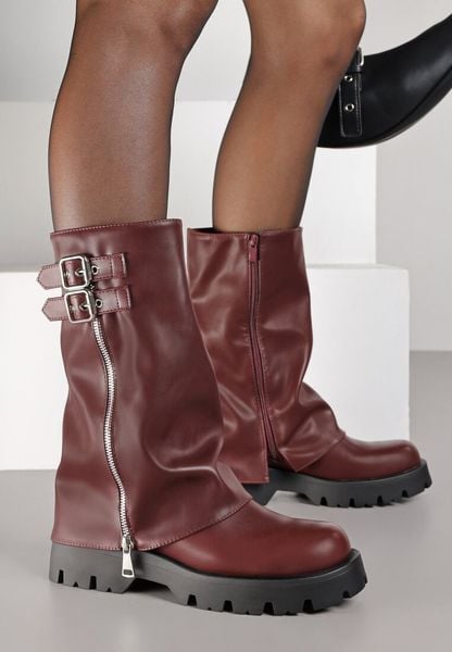 Bordowe Botki Biker na Platformie z Wywiniętą Cholewką z Suwakiem i Klamerkami Selade