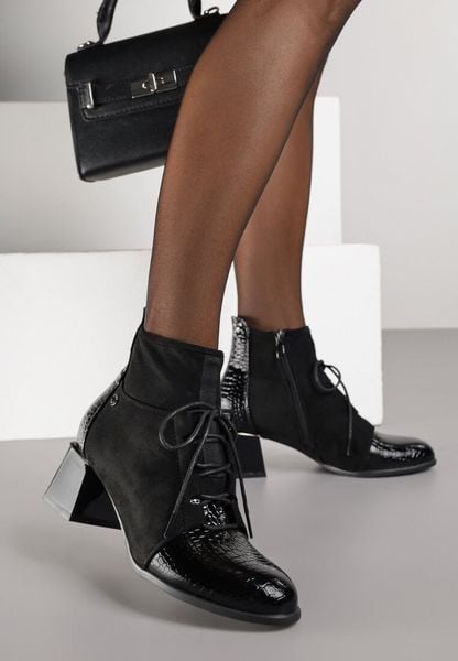 Czarne Botki Trzewiki Vices na Obcasie z Lakierowanymi Wstawkami Adanella