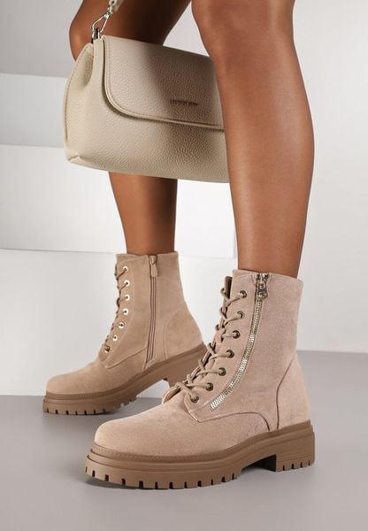 Ciemnobeżowe Botki Typu Workery z Metalicznym Suwakiem Clatina