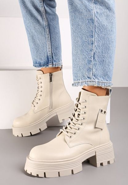 Beżowe Sznurowane Botki Workery ze Skóry Naturalnej na Płaskiej Podeszwie z Aplikacją Cresa