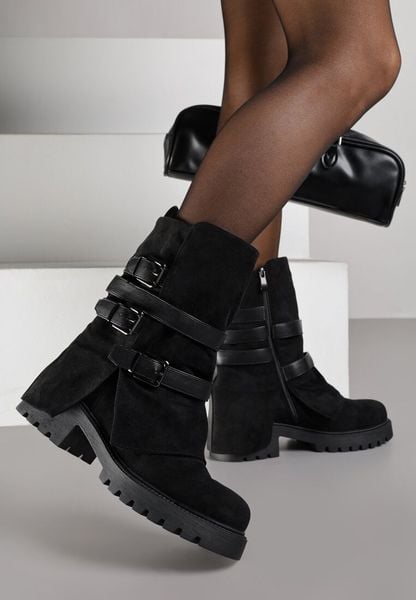 Czarne Botki Bikery Ozdobione Klamrami i Wywiniętą Cholewką Seride