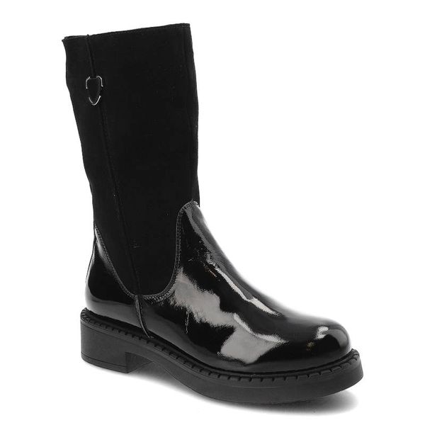 Botki damskie Pollonus, cholewka z lakierowanej skóry naturalnej połączonej z zamszową wstawką stabilny obcas oraz gruba podeszwa z wyraźnym profilem
