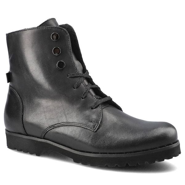 Botki damskie Karino, czarna skóra licowa ze sprzączką i sznurowaniem, czarne, 2288-076-F