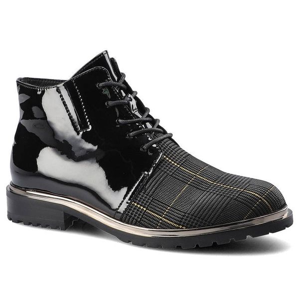 Botki damskie Artiker, sznurowany fason łączone materiały o kontrastowych fakturach lakierowane elementy tekstylny panel we wzór kratki, czarne, 47C1
