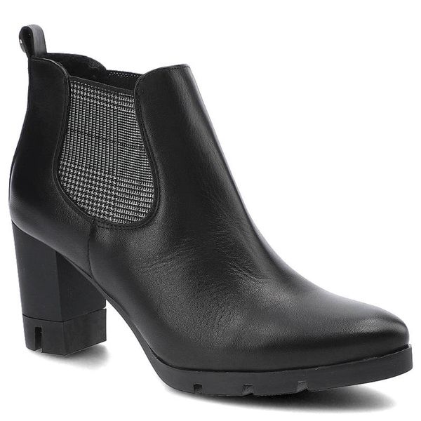 Botki damskie Karino, skóra licowa z materiałowymi wstawkami na stabilnym klocku, czarne, 1443-053-F
