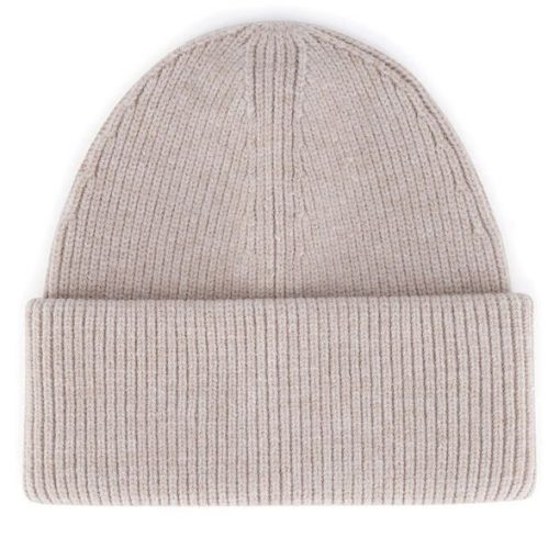 Beżowa Czapka Typu Beanie z Wełną i Wiskozą Ozdobiona Naszywką Borirra