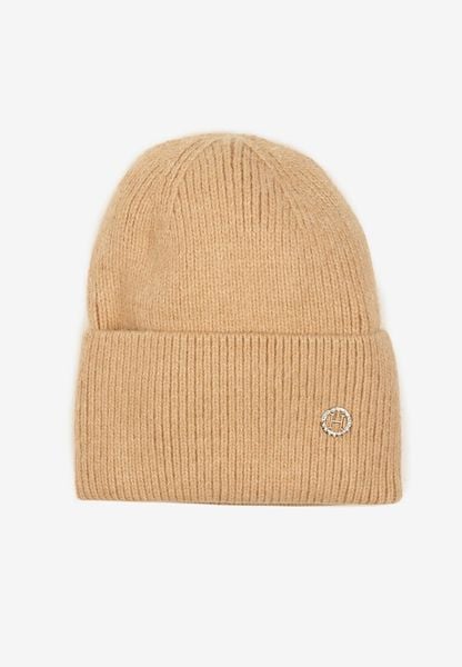 Beżowa Czapka Beanie z Dodatkiem Angory i Metaliczną Aplikacją Delathor