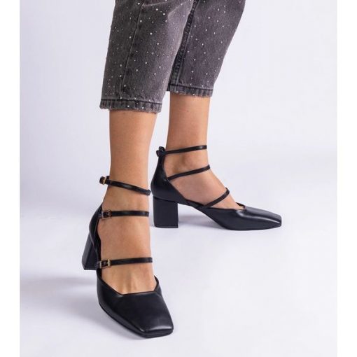 Czarne Lakierowane Czółenka na Słupku Ozdobione Paskami ze Sprzączkami Dlivina
