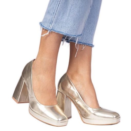 Złote metaliczne czółenka na masywnym słupku z kwadratowym noskiem złoty