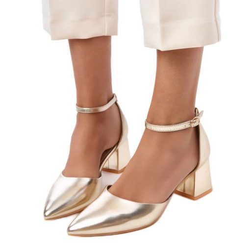Złote czółenka na słupku zapinane na kostce Keris złoty. Sprawdź na butymodne.pl! Czółenka damskie od Innej marki w świetnej cenie. Promocje oraz darmowa dostawa.