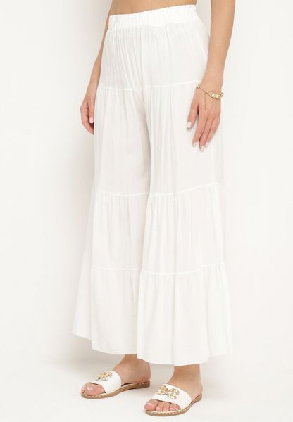 Białe Szerokie Spodnie z Wiskozy z Gumką w Talii Ozdobione Falbanką Dimlea