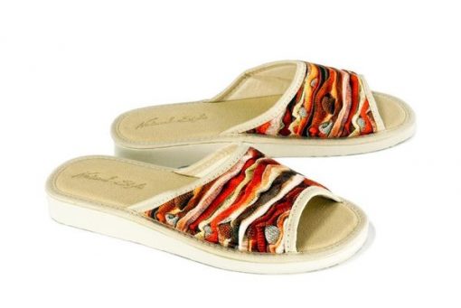 Kapcie damskie. Kolekcja Natural Style firmy Meteor. Przewiewna, tekstylna cholewka. Miękka wkładka. Elastyczne, nie zostawiające śladów podeszwy.