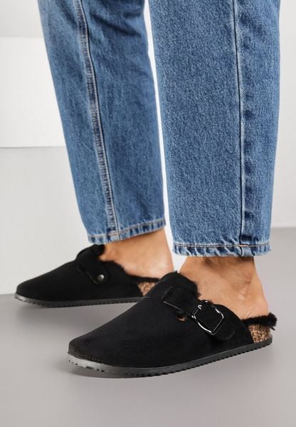 Czarne Kapcie Chodaki na Korkowej Podeszwie z Paskiem i Klamrą Aponella