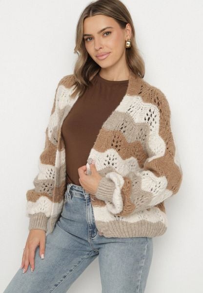 Beżowo-Brązowy Kardigan w Ażurowy Wzór z Dodatkiem Wełny i Wiskozy Esilla
