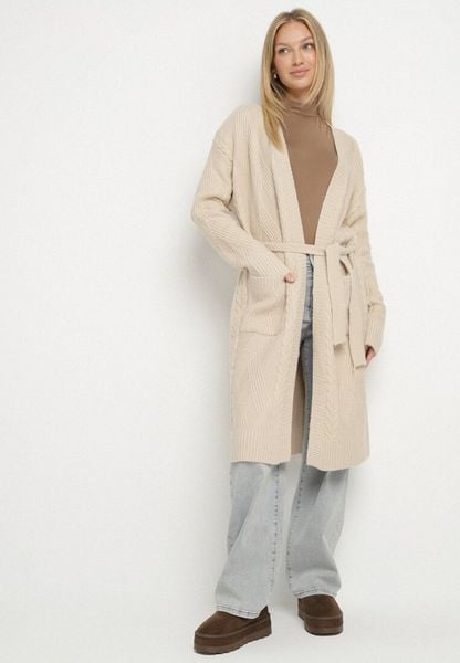 Jasnobeżowy Niezapinany Kardigan z Wełną z Warkoczowym Splotem i Wiązanym Paskiem Darrive