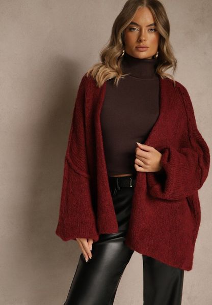 Bordowy Niezapinany Kardigan Nietoperzowy z Dodatkiem Wełny i Wiskozy Rallidia