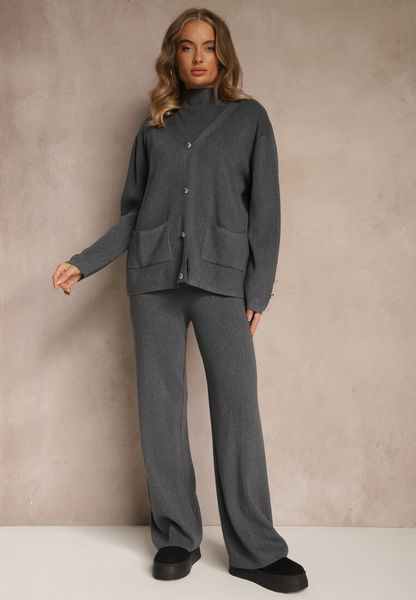 Szary Komplet z Dzianiny z Bawełną Spodnie Kardigan i T-shirt z Golfem Ralonia