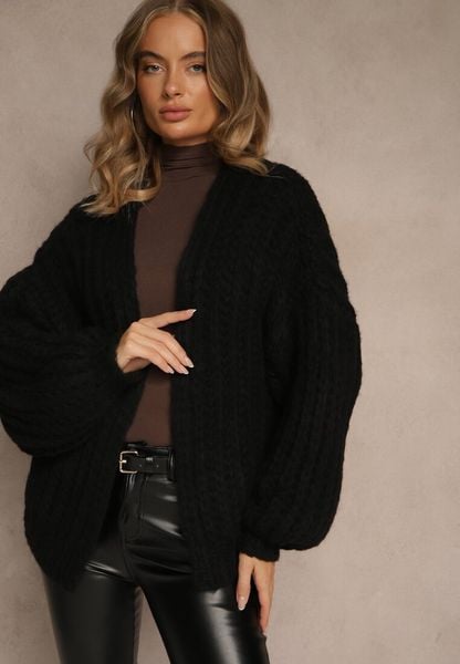 Czarny Oversizowy Kardigan Bez Zapięć z Dodatkiem Wełny i Wiskozy Titanesa