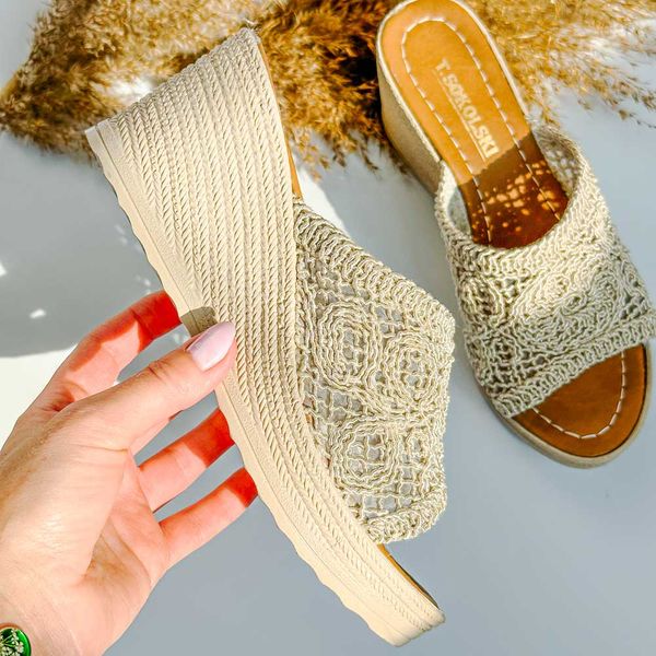 Beżowe plecione klapki damskie na koturnie T.Sokolski 321