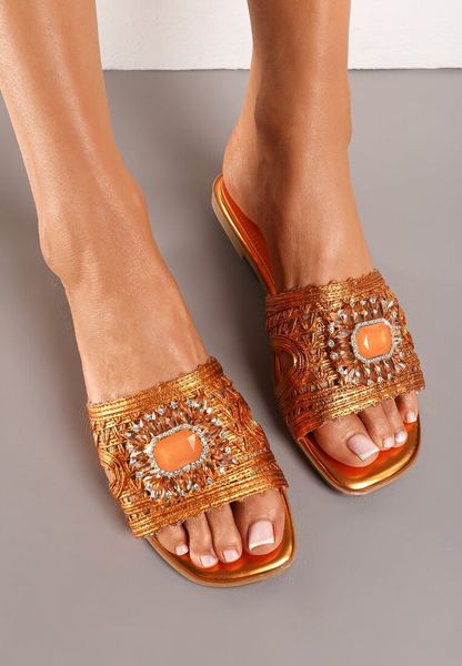 Pomarańczowe Klapki z Imitacji Skóry z Paskiem Ozdobionym Kamieniami Allmina