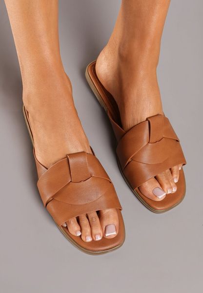 Jasnobrązowe Klapki na Płaskiej Podeszwie z Ozdobnymi Paskami i Kwadratowym Noskiem Lunivia